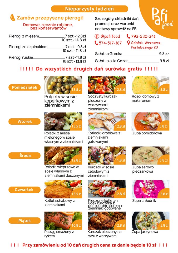Pozwól nam zachwycić Cię naszą tradycyjną polską kuchnią. Zdrowe dania i kuchnia domowa przekonają Cię. Musisz spróbować naszej wyjątkowo pysznej zupy lub pierogów. Wielu gości przychodzi do nas, aby posmakować naszych pysznych naleśników. Przyjdź do nas na kolację! Samochód możesz łatwo zaparkować przed cateringiem na bezpłatnych parkingach. U nas możesz zapłacić gotówką lub przelewem bankowym, zbliżeniową płatnośćią, kartą MasterCard, kartą VISA oraz kartami debetowymi. Możesz odwiedzić nas przez 5 dni w tygodniu od godziny 12.00 do 16.00. Nasze dni wolne to sobota i niedziela.